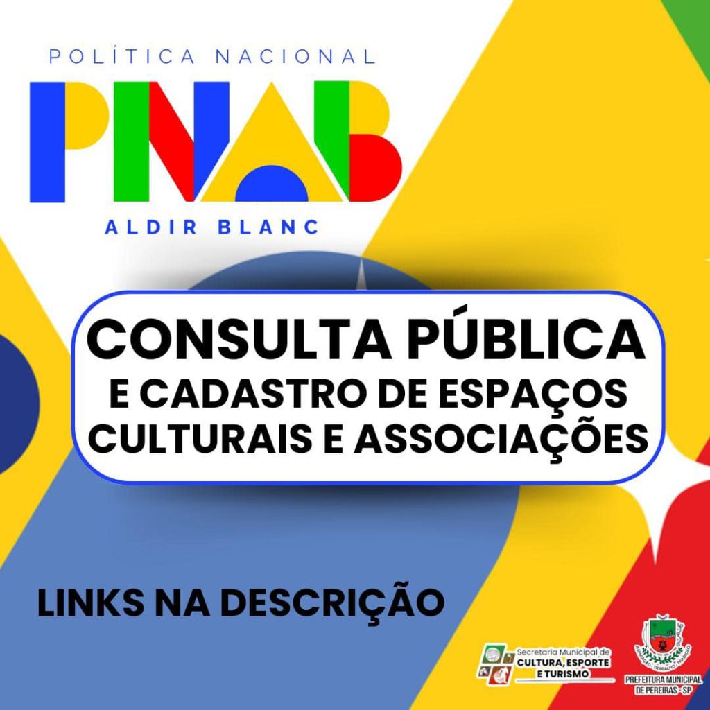 A Secretaria de Cultura de Pereiras abre Consulta Pública visando colher sugestões da comunidade artística de nossa cidade para nortear a elaboração de editais para destinação dos recursos oriundos da Politica Nacional Aldir Blanc. A sua contribuição será de grande valia para que os recursos cheguem até os artistas locais.