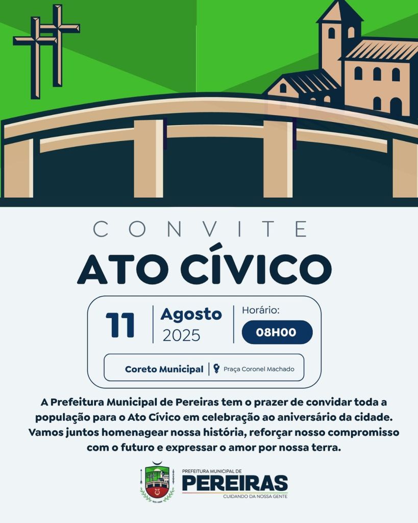 A Prefeitura Municipal de Pereiras convida toda a população para participar do Ato Cívico em comemoração ao aniversário da nossa cidade.