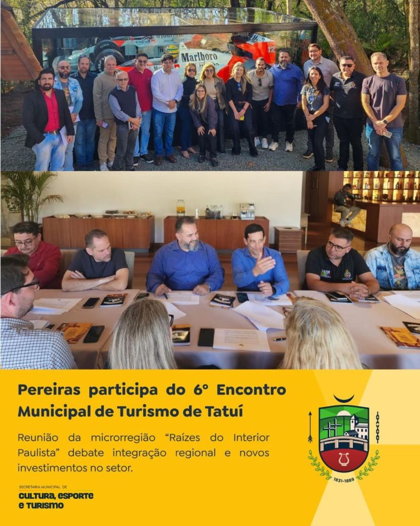 O município de Pereiras marcou presença no 6º Encontro Municipal de Turismo de Tatuí, realizado no Sítio do Carroção, com a participação do secretário municipal de Cultura, Esporte e Turismo, Calixto Neto. O evento reuniu representantes das dez cidades que integram a microrregião turística “Raízes do Interior Paulista”, que tem como objetivo fortalecer o desenvolvimento regional e promover o intercâmbio entre os municípios.