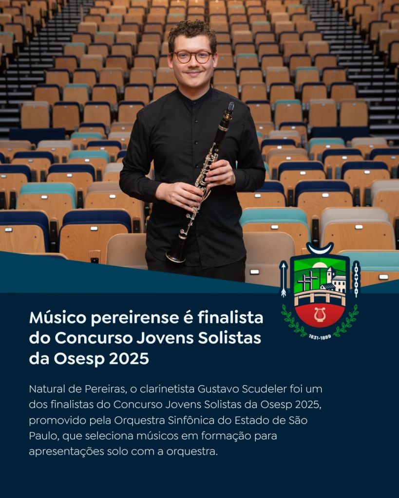 O clarinetista Gustavo Scudeler, natural de Pereiras, foi um dos finalistas da edição 2025 do Concurso Jovens Solistas da Osesp, promovido pela Orquestra Sinfônica do Estado de São Paulo. Realizada anualmente, a iniciativa é considerada uma das principais vitrines para jovens músicos eruditos em formação no Brasil.